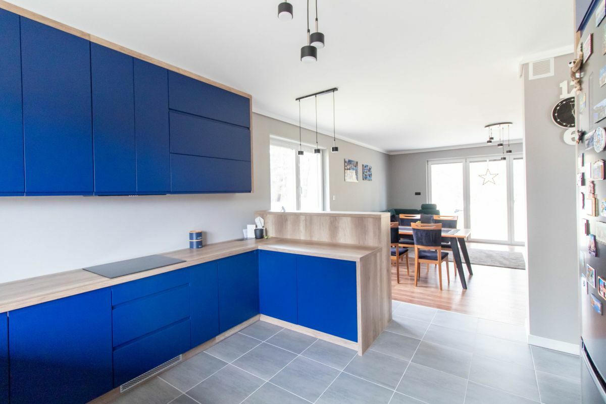 Nowoczesna kuchnia w zabudowie z wysokiej klasy sprzętem AGD (indukcja, szafki cargo z koszami).